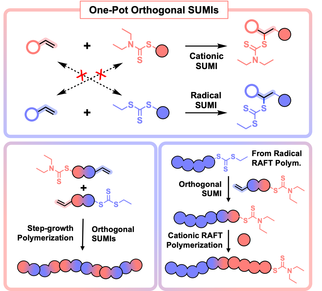 单倍单体单元插入(SUMI)技术因其高度的通用性和高效性,已成为合成序列控制乙烯基聚合物的重要策略。本项工作的核心是通过条件筛选构建了一类具有正交特性的SUMI 技术,使阳离子与自由基SUMI能够在同一体系下相互兼容的高效进行。课题组的前期研究首次报道了基于阳离子的SUMI过程,使用包含拉电子酯基的乙烯基醚单体或者苯乙烯类单体,优选二硫代氨基甲酸酯作为链转移剂,成功实现了这类单体的阳离子SUMI反应 (J. Am. Chem. Soc. 2023, 145, 3636−3646)。