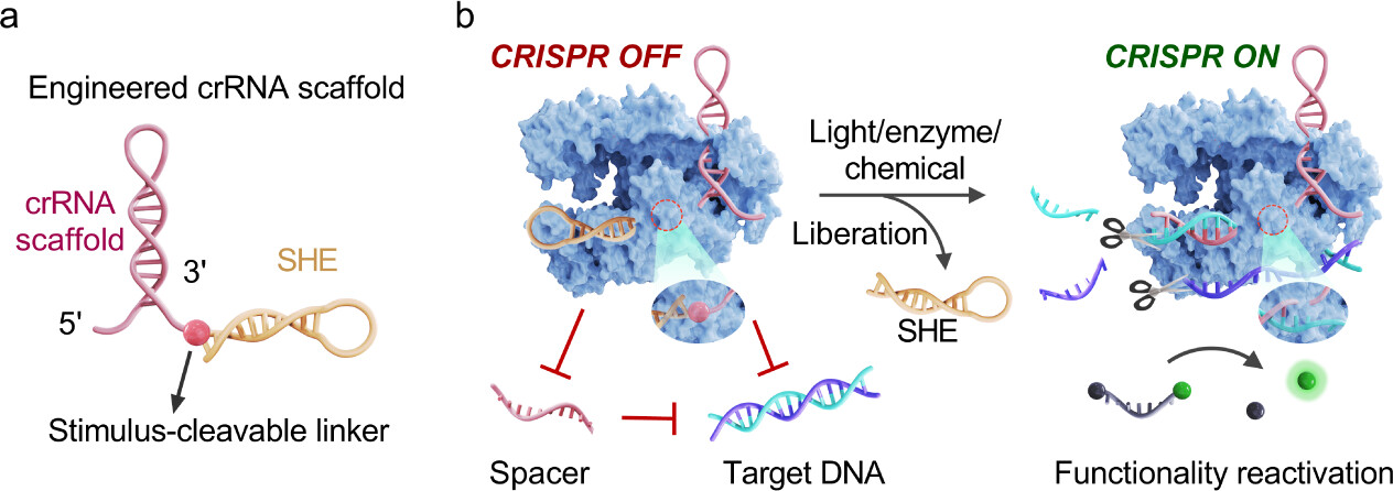 为了解决这一关键难题,我院杨荣华教授和熊二虎教授团队进行了一系列创新性的研究工作。团队人员通过在CRISPR系统crRNA支架的3′末端巧妙地引入了一个具有空间位阻效应(SHE)的基序,并利用可刺激响应切割的连接子将其与crRNA支架连接,创新性地提出了一种模块化调控CRISPR-Cas12a系统活性的策略。该团队对不同大小和结构(包括线性、双链、发夹和三链)的SHE进行了系统性的评估,结果表明,CRISPR-Cas12a功能的抑制效应与空间位阻的大小和结构密切相关。特别值得一提的是,那些能够完全抑制CRISPR-Cas12a功能的有效SHE在紫外光照射下可以被成功释放,从而恢复系统的活性,这一发现为实现对CRISPR-Cas12a系统的精准调控提供了重要的技术手段。此外,该crRNA支架工程化策略不仅适用于LbCas12a系统,也可以很容易地推广到其他V-A型Cas12a同源物,显示出良好的普适性。