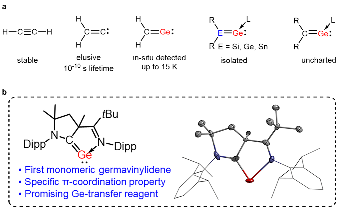 重主族元素(价电子主量子数大于等于3)间形成的多重键具有全新的成键模式,呈现独特的构型,被称为“非经典多重键”或“极性配价键”。与经典有机分子的多重键化合物相比,重主族元素衍生物在成键方式、稳定性和反应性等方面均表现出截然不同的特性,成为主族化学家的关注重点之一。亚乙烯作为乙炔的同分异构体,表现出极高的活性,寿命仅为10-10 s。然而将亚乙烯中的碳原子替换为更重的十四族元素后,其稳定性有了明显改善,例如1-锗杂亚乙烯在15K的条件下可以进行原位谱学监测。此外,Lewis碱的引入可以进一步提高亚乙烯类化合物的稳定性,从而实现分离。但是由于合成前体与合成方法的限制,目前具有R2C=Ge结构的锗杂亚乙烯尚未被成功合成。