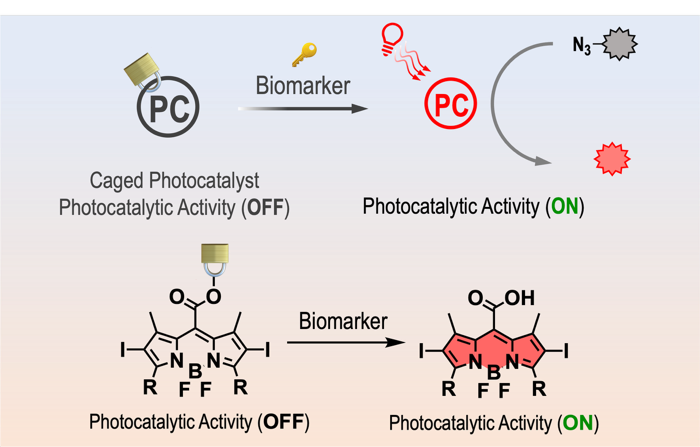 近日,我院杨荣华/刘固寰教授团队报道了一种创新的光控平台,通过结合生物标志物触发和光催化技术,实现了“智慧型”药物释放和生物成像。这项技术不仅提升了光控反应的精准度,还为未来的精准医疗提供了全新思路,成果发表于《Angew. Chem.》,标题为:“Biomarker-Gated Photocatalysis Uncaging in Live System”。通过选择了一种特殊的光催化剂——二碘BODIPY羧酸,并通过化学修饰将其“锁定”,使其在正常情况下完全失去活性。只有当特定生物标志物(如酶或氧化物质)出现时,这种光催化剂才能被“解锁”,恢复其催化活性。这种设计不仅提高了系统的安全性,还确保了药物或信号仅在目标部位释放。