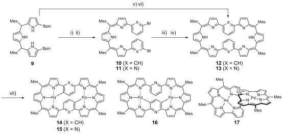 扩环卟啉由于其丰富的光电性能、金属络合性能以及氧化还原性能受到了科学家们的广泛关注。基于该课题组前期的工作(Angew. Chem. Int. Ed.,2016, 55, 6438;Chem. Commun. 2019,55, 11454)近期,该课题组以三吡咯烷-a,a'-二(频哪醇硼酸酯)9及间二溴苯/2,6-二溴吡啶为原料,利用Suzuki偶联的方法合成了苯掺杂、吡啶掺杂的八元扩环卟啉化合物(12/13)。12与醋酸钯作用只形成一种双侧插Pd产物14,而13可以与醋酸钯作用同时得到了双侧插钯产物15,单侧插钯产物16和螺环化合物17。15与16在三氟醋酸的作用下能够相互转化。研究表明吡啶杂环的引入,丰富了八元扩环卟啉类金属配位结构的多样性与可调控性,为新型分子开关的设计提供了新的思路。