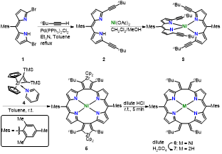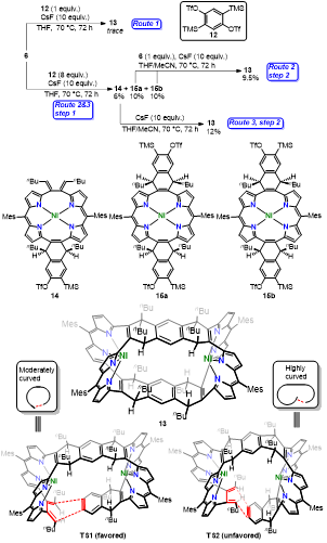该文中作者将环金属化反应应用于卟啉(2.1.2.1)类化合物的合成中,以50%的收率得到了目标分子6。在此基础上,使用双苯炔与其进行Diels-Alder反应,得到了含有卟啉(2.1.2.1)单元的纳米桶。该文还对此纳米桶对氯仿的识别性能进行了详细的研究。