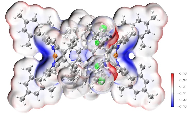图3.卟啉(2.1.2.1)纳米桶与其空腔内氯仿分子作用后的静电势图