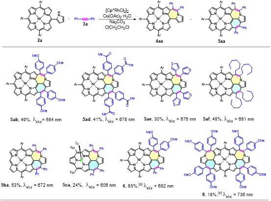 图1.铑催化[5+2]成环反应合成七元环稠合卟啉及部分产物