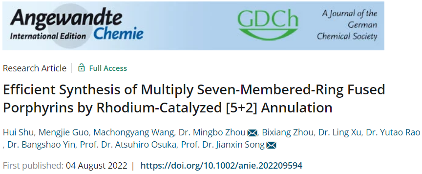 近日,402永利集团宋建新教授团队周明波研究小组在卟啉类功能分子的设计、合成与性能研究方面再度取得重要进展,并在国际化学顶级期刊《德国应用化学》发表题为“Efficient Synthesis of Multiply Seven-Membered-Ring Fused Porphyrins by Rhodium-Catalyzed [5+2] Annulation”的学术论文(Angew. Chem. Int. Ed.2022,61,e202209594)。该论文获得了评审人的高度评价,并被推为HotPaper。
