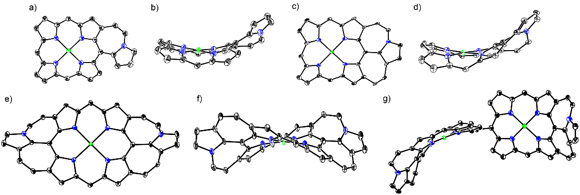 代表性化合物的结构通过X射线单晶衍射分析得到确认。相较其前体,稠合一个或两个七元环后,卟啉母体明显起褶皱,整个分子呈马鞍型;稠合四个七元环的卟啉分子则发生了明显的扭曲;对于二聚体10,通过单键相连的两部分几乎处于垂直的几何关系。