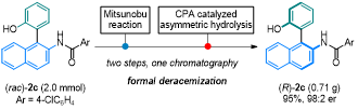 此外,反应可以采用外消旋联芳基胺基酚衍生的酰胺作为原料,通过形式上的去消旋化反应,实现克级手性产物的合成。具体反应过程如下:外消旋联芳基酰胺通过Mitsunobu反应获得1,3-氧氮杂䓬桥联联芳基化合物,然后再经由手性磷酸催化的不对称水解开环反应即可获得手性产物。