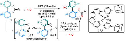 轴手性联芳基化合物广泛存在于天然产物、药物分子以及手性催化剂中,发展构建轴手性化合物的方法学具有重要的意义。基于桥联联芳基化合物的催化不对称开环反应是获得轴手性联芳基化合物的一种有效且实用的合成策略。目前这一研究方向的进展主要集中于含五元环或六元环桥联联芳基化合物的不对称开环反应;相比之下,对含有中环桥联联芳基化合物的催化不对称开环反应报道很少。其原因可能是具有中环桥联联芳基化合物难以合成且反应活性难以预测。