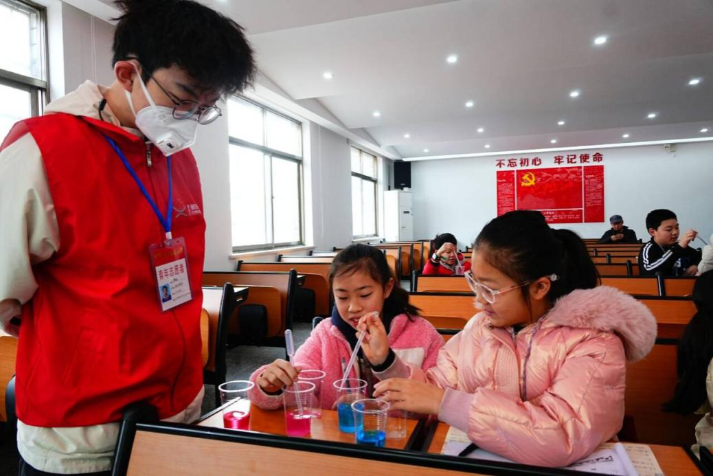 志愿者指导小朋友做实验