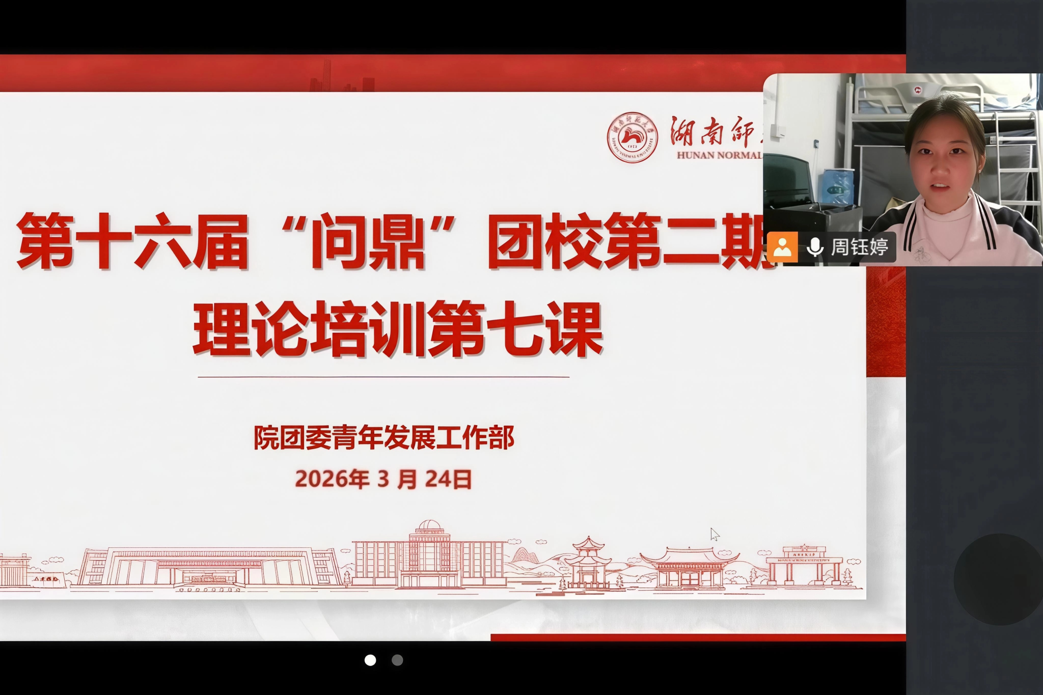 (通讯员 周钰婷 杨绣云)3月24日下午,402永利集团第十六届“问鼎”团校理论培训第七课以线上腾讯会议形式开展。此次活动以“遵义精神永铸,红色薪火相传”为主题,由院团委青年发展部干事周钰婷主持,第十六届“问鼎”团校全体学员共同参与。