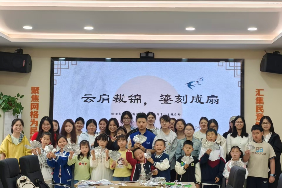 (通讯员 党枢)4月11日下午,我院绘心民俗社在学堂坡社区开展“魅力民俗,快乐周末”之“云肩裁锦,鎏刻成扇”主题手作活动。理事会成员带领20名学生志愿者,与社区儿童共同参与此次活动。