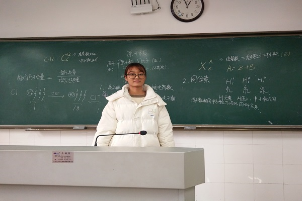 在笔试成绩出来之后,通过笔试的同学被重新分为了三组,以更加严格的要求开展了接下来的活动。首先,杨蛟婕给同学们讲了面试报名及缴费截止时间,提醒同学们要及时确认报名成功,随后还给同学们讲述了《湖南2018年下半年中小学教师资格证考试(面试)公告》中的内容,带领大家熟悉面试流程。活动正式开始,在此次活动中,小组成员杨晨、肖佩捷、黄静、翦华圣、杨蛟婕、李艳芳、贾英华依次登台进行了讲课。杨晨同学为大家讲授了酯化反应,肖佩捷讲授了金属腐蚀,黄静讲授了原子核的内容,翦华圣讲授了甲烷,杨蛟婕讲授了原电池的原理,李艳芳讲解了电解池的原理,贾英华讲授了金属的化学性质。小组成员授课完毕后,杨蛟婕对大家的授课进行了点评,并通知了下次活动的安排。