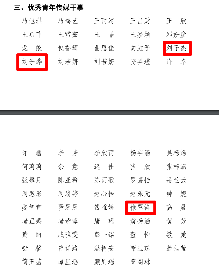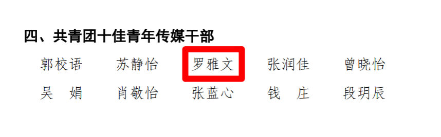 此外,我院青年传媒中心指导老师唐健清荣获“共青团宣传思想文化工作先进工作者”称号,罗雅文同学荣获“共青团十佳青年传媒干部”称号。 在青年传媒中心先进典型的表彰中,我院罗雅文、晏紫霖两位同学被评选为优秀青年传媒干部,刘子杰、刘子烨、徐覃祥三位同学被评选为优秀青年传媒干事。