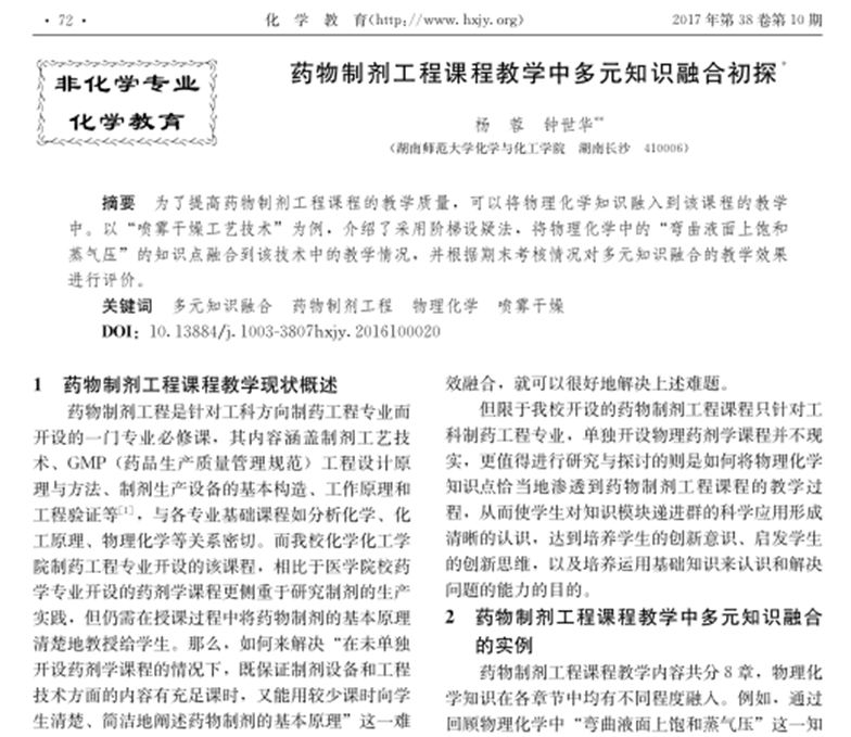 杨蓉,钟世华*.药物制剂工程课程教学中多元知识融合初探[J].化学教育,2017,38(10): 72-74.