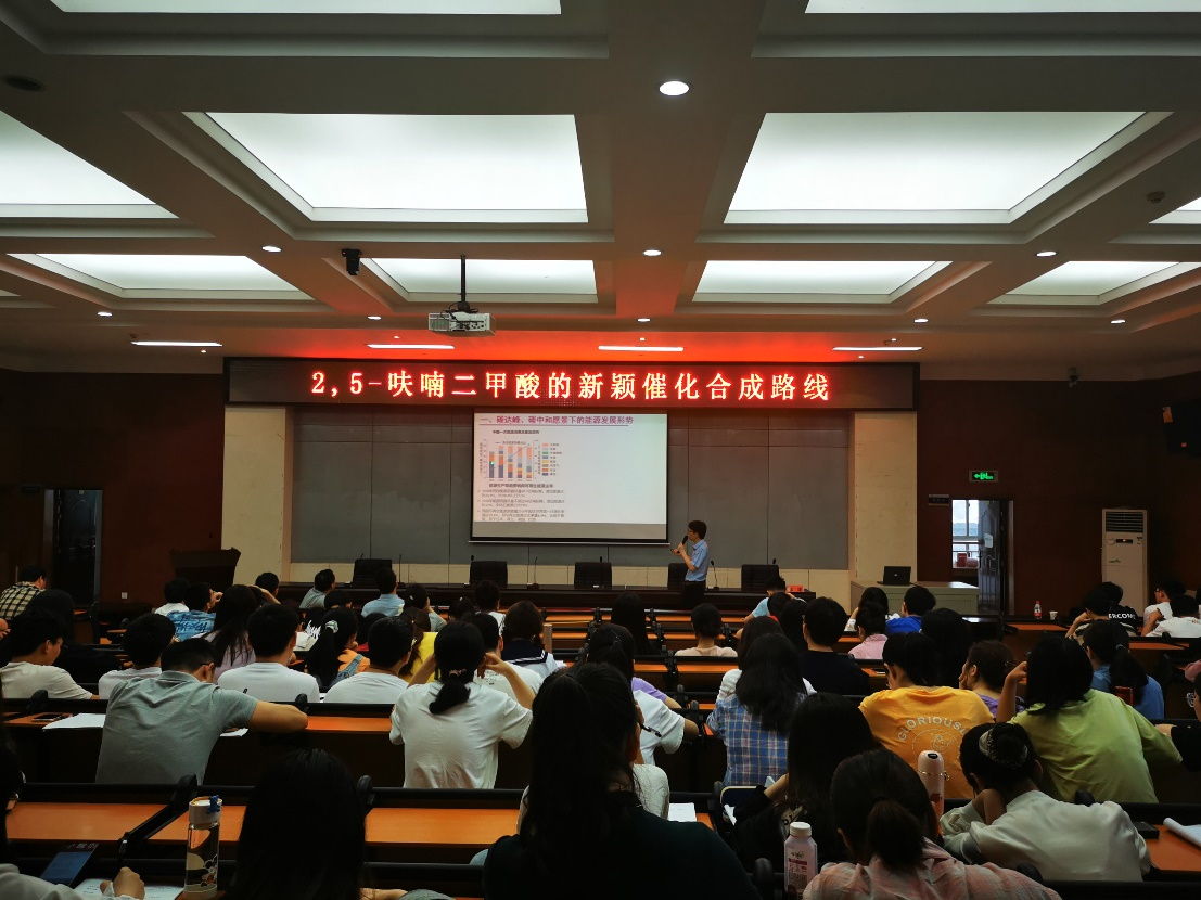 报告主要介绍了在万吨级5-羟甲基糠醛(HMF)生产及百吨级HMF加氢生产示范,以及近期开展的热催化和电催化制备FDCA的研究。报告的内容对我院相关课题组的工作有很大的指导性作用,对同学们的科研之路也有很大的启发作用。最后,张老师结合自身经历谈了三点感想,鼓励学生们敢于打破陈规,培养自主思维意识。报告结束后,师生们的反响热烈,踊跃提问,张老师耐心仔细地逐一解答,获得了在座听众的阵阵掌声。