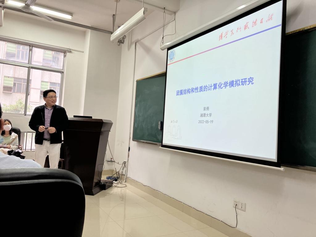 5月19日下午,国自科优秀青年基金获得者、湖南省“芙蓉学者”、湘潭大学化学学院院长、博士生导师裴勇教授应邀来我院作了题为“团簇结构和性质的计算化学模拟研究”的学术报告。