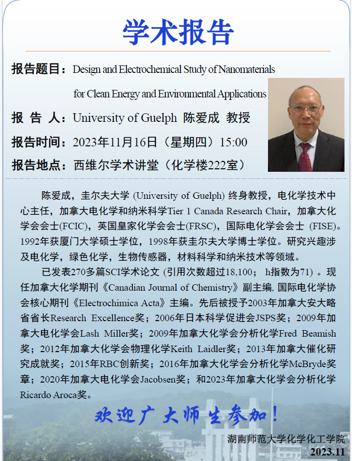 Abstract: With rapidly mounting environmental concerns, coupled with the accelerated depletion of fossil fuels, there is a significant demand for the development of advanced technologies for the sustainable energy production and environmental remediation. Nanostructured materials with high surface areas have garnered significant interests due to their unique properties and impressive applications spanning electrocatalysis, photocatalysis, energy conversion and storage, sensing, and wastewater treatment. Recently, the Chen research team has designed and investigated a variety of functional nanomaterials. In this talk, the synthesis and surface characterization of advanced palladium, gold, copper, and graphene-based nanomaterials are presented. The electrochemical properties of these nanomaterials as well as their promising applications in hydrogen production and storage, CO2 reduction, and electrochemical sensing are highlighted. The critical roles of nanostructured surfaces in the development of advanced electrochemical technologies for clean energy and environmental applications are discussed.