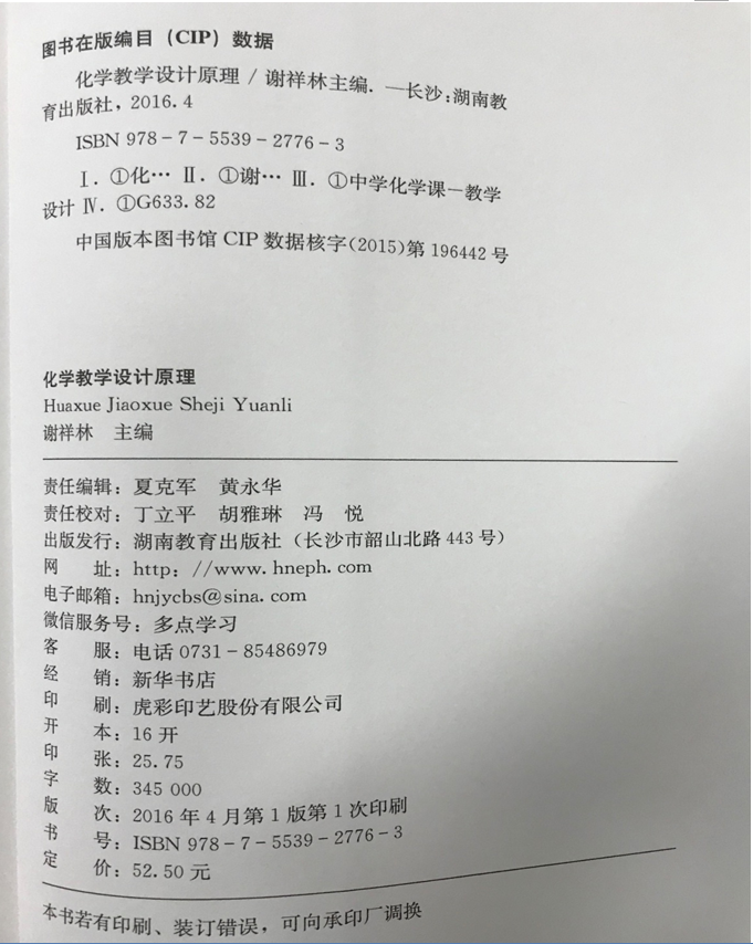 (3) 谢祥林主编《化学教学设计原理》(国家级化学专业综合改革试点项目)湖南教育出版社,2016